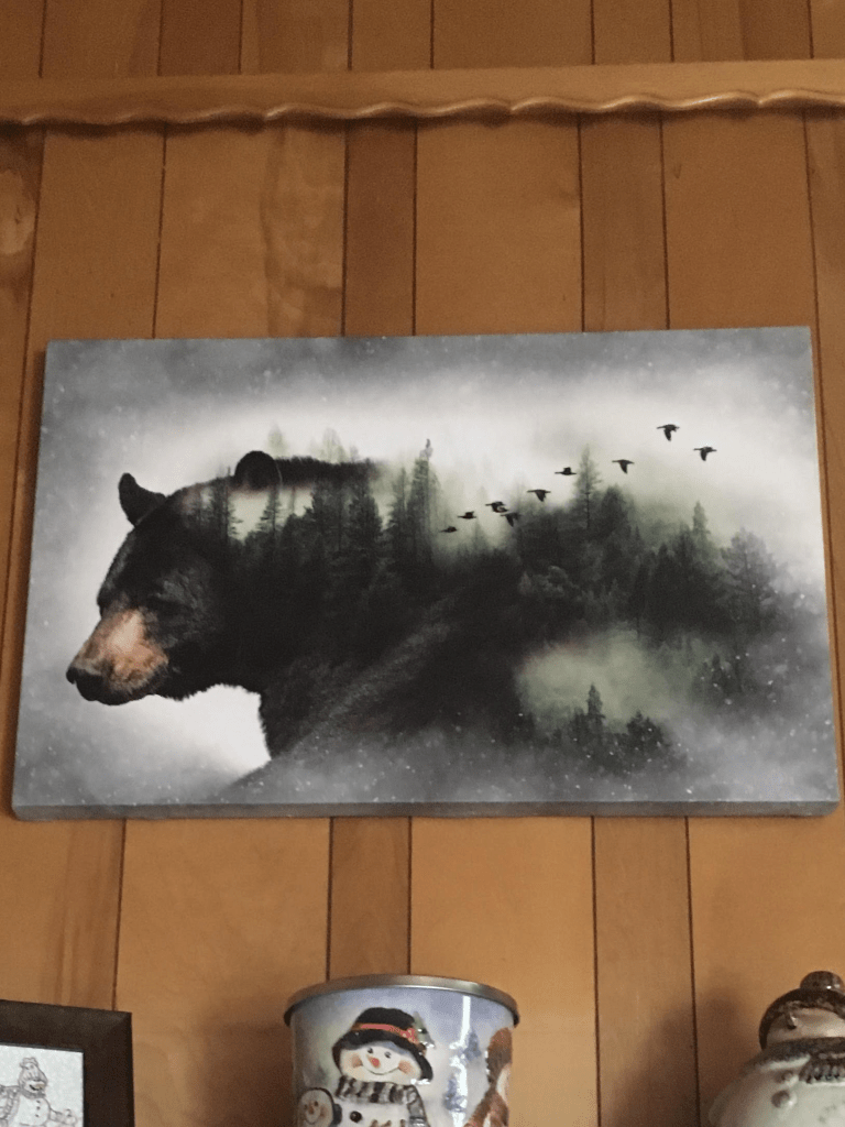 This was one of the art projects I made. I just love this art piece. The bear with the lake sitting right on top of his head and the birds flying high over the mountain top. Majestic.