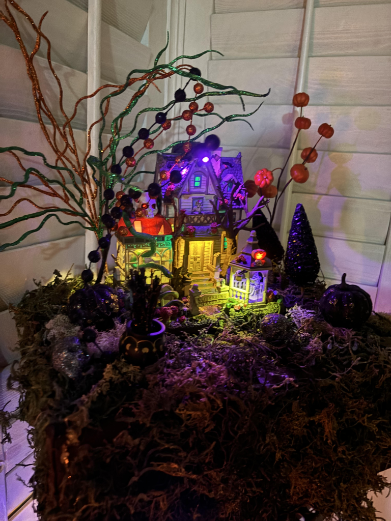 So this is what I did. I added moss to the platform, all the plants and trees and then placed my cute little house right on top. I think it turned out pretty cute. I love the way I added the garland and lights to the lower part of the base. I’m not sure I’ll be adding any more Halloween Village pieces around the house this year. I may just put the rest of the Halloween away and get ready to start creating my Christmas Village platforms.