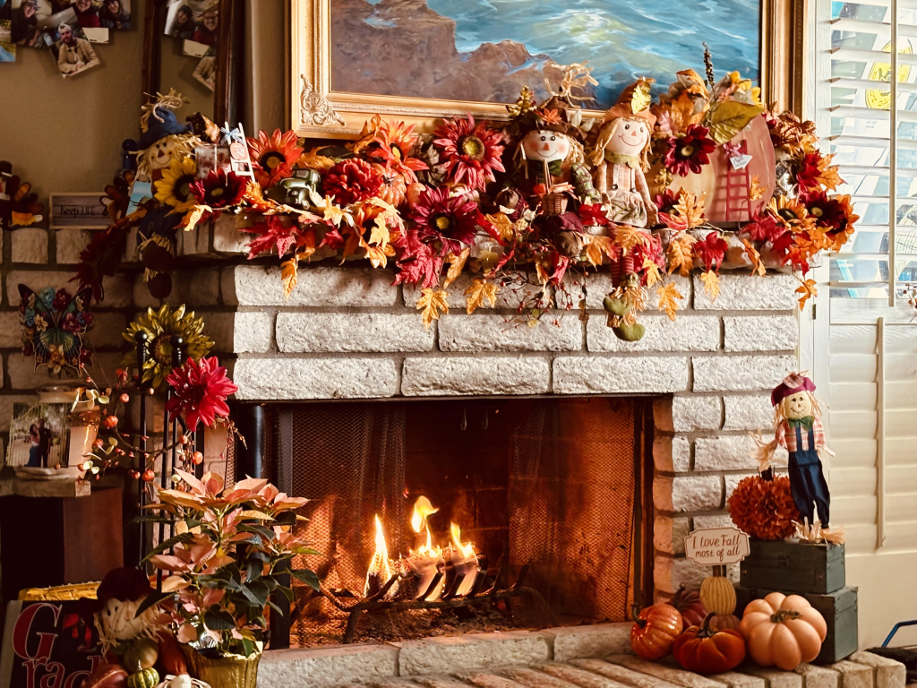 Below is a photo of my mantel. I know I shared it with you last week but tonight, it’s more complete. I have a fire going.