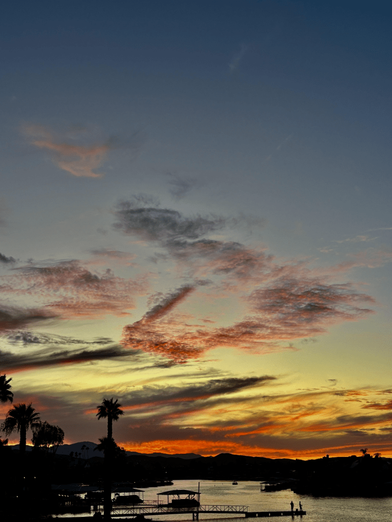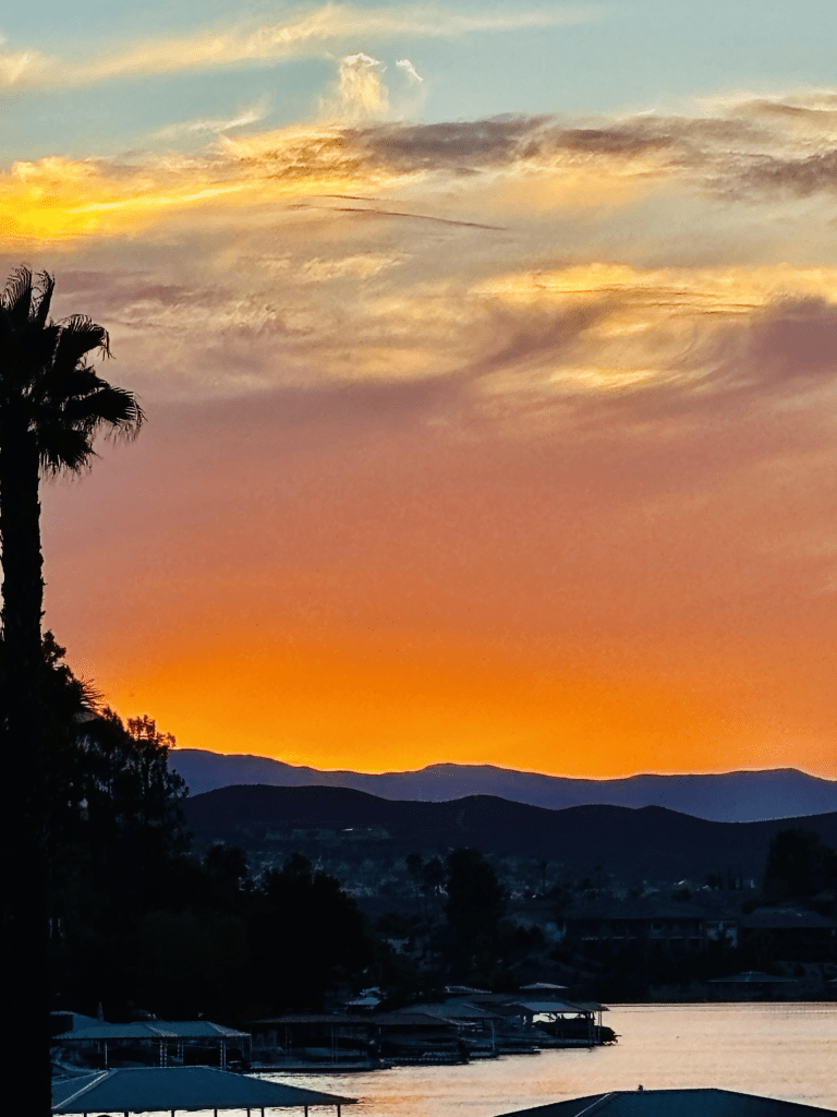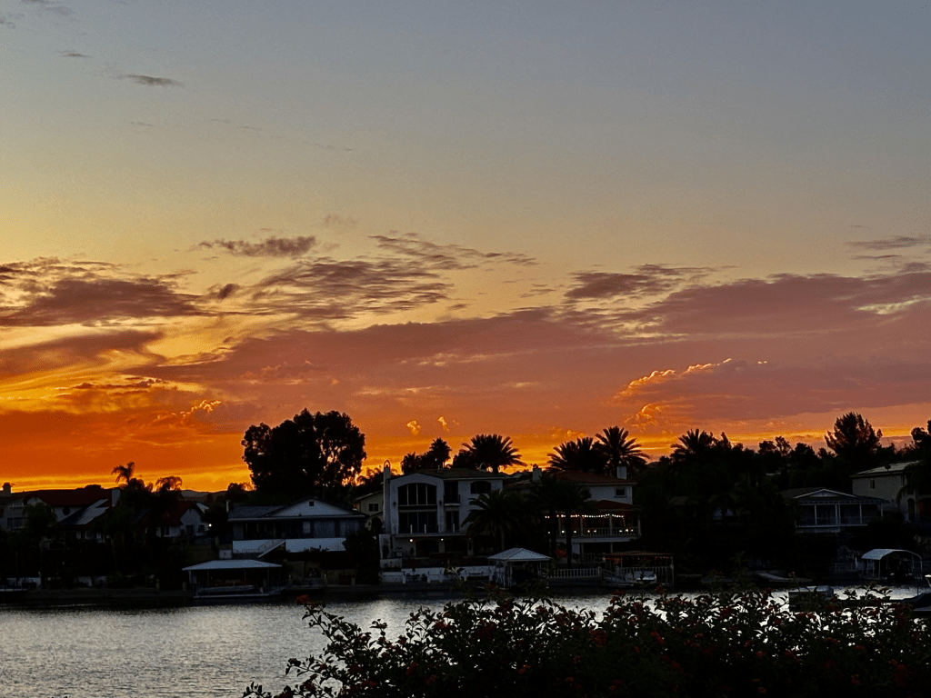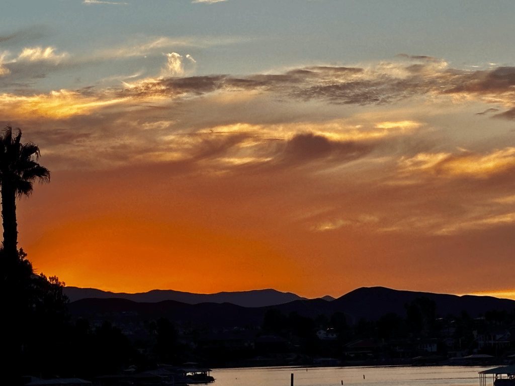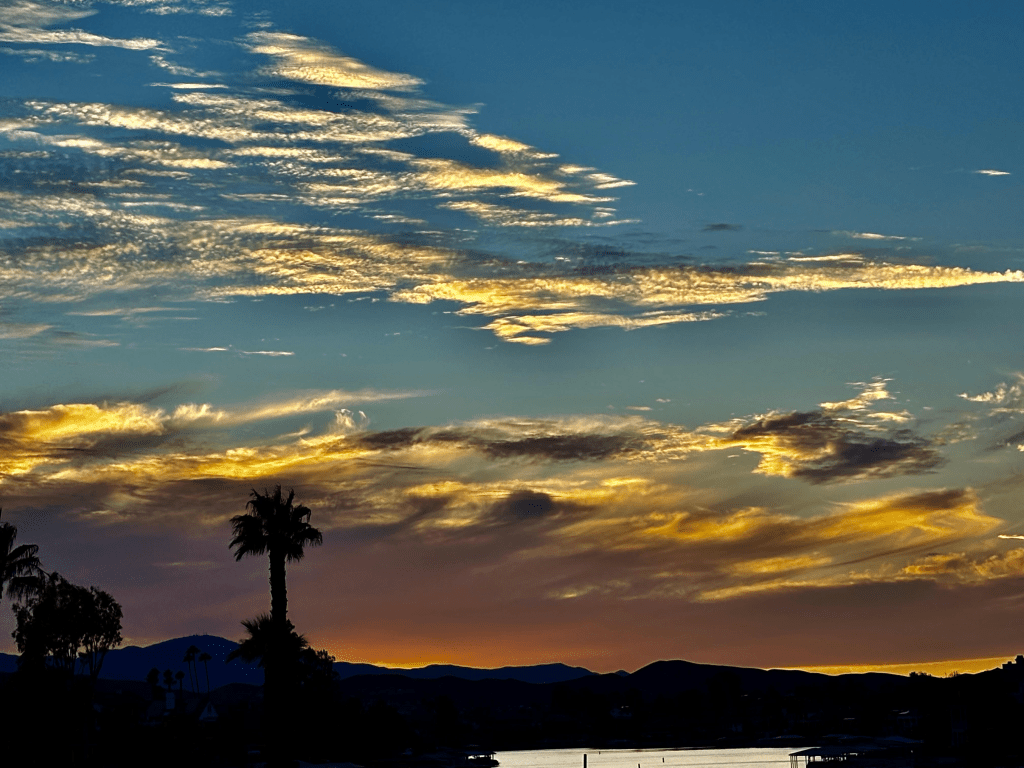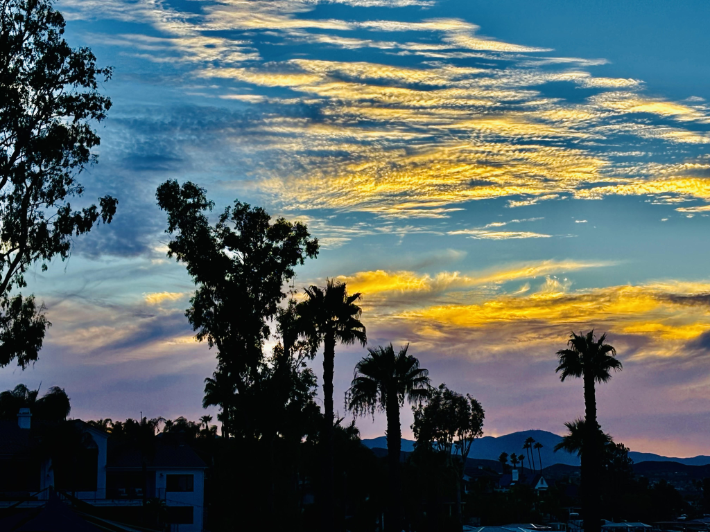 I went out to the pool this afternoon with some gal friends. We swam. We talked. I even had a High Noon. Yummy. Anyway, after swimming I went out to watch this incredible sunset. One of the greatest I’ve been blessed to see, or maybe it was extra special because I fully embraced every part of it. John joined me along with my friend Sandy. John said, “look at that sky, God is painting us an amazing sunset isn’t He.”