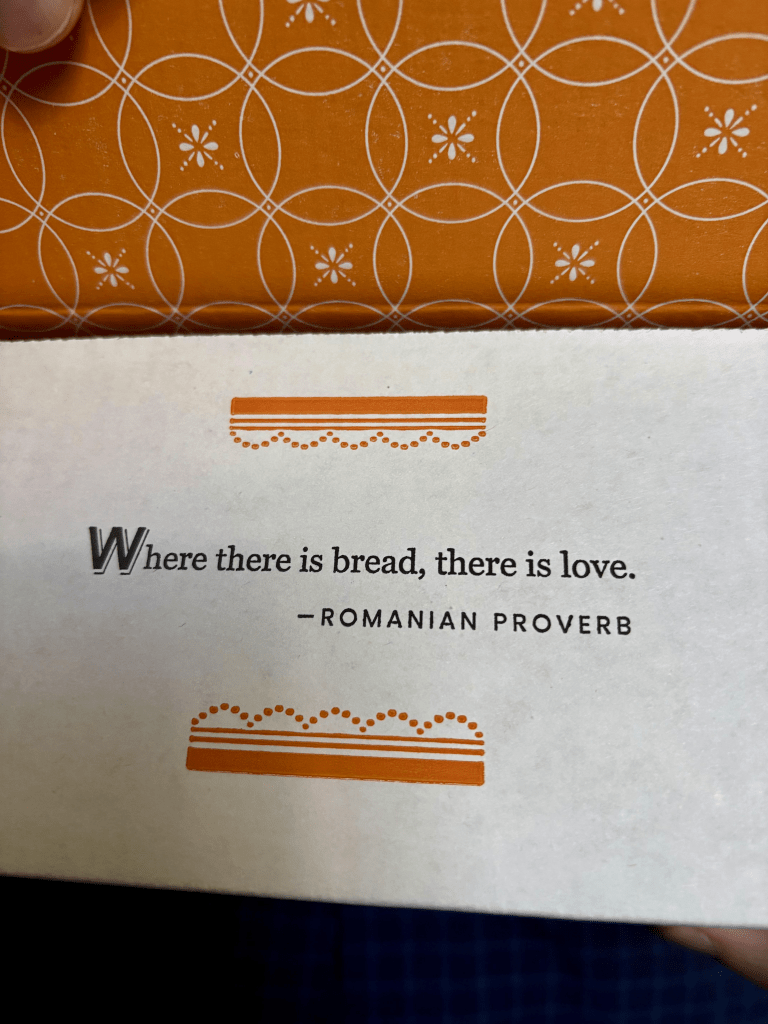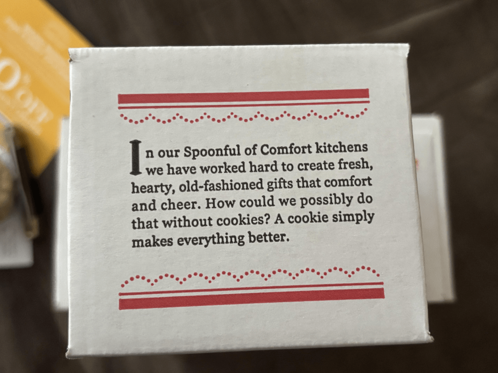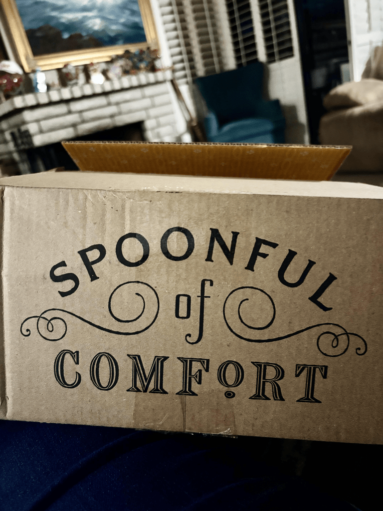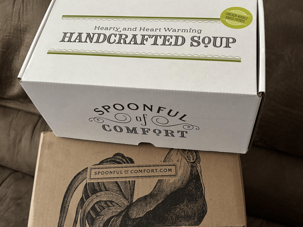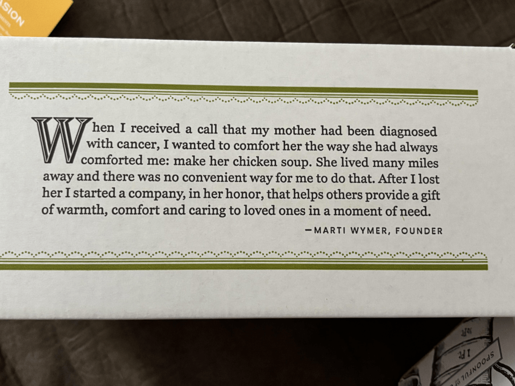 The attention to detail in the packaging alone is extraordinary. When I picked up the box I was met with beautiful sayings and artwork. Each side of the box had something different written on it. One side said, “spoonful of comfort”. The other side said “spoonful of comfort” with a steam coming from the ladle that was filled with soup. The third side had a very attractive rooster with the business’s website, “spoonfulofcomfort.com” and finally, the fourth side said simply, “packed with care and caring. What’s inside was selected by someone who is thinking of you”.