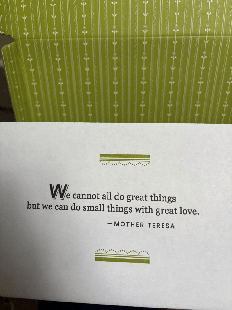 Each box not only had the company’s logo, which by the way is beautiful, it had sayings on the outside as well as inside. Instead of me writing what they are, I’ll share photos of my perfect pick-me-up gift that was sent from a woman I’ve never met. A who cares enough about her employees to not only take them into consideration and show them kindness and compassion when they are met with illness or whatever big thing is happening in their lives, Stacy cared enough about the spouse of her employee. Me.