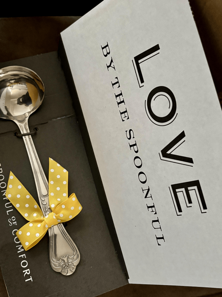 I thought wow! Then I could hardly wait to see what was inside. As I opened the box I was met with three additional boxes and a stunning silver ladle with a tiny yellow bow wrapped around it. On the ladles packaging it read, “Love by the spoonful”.