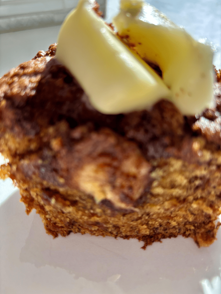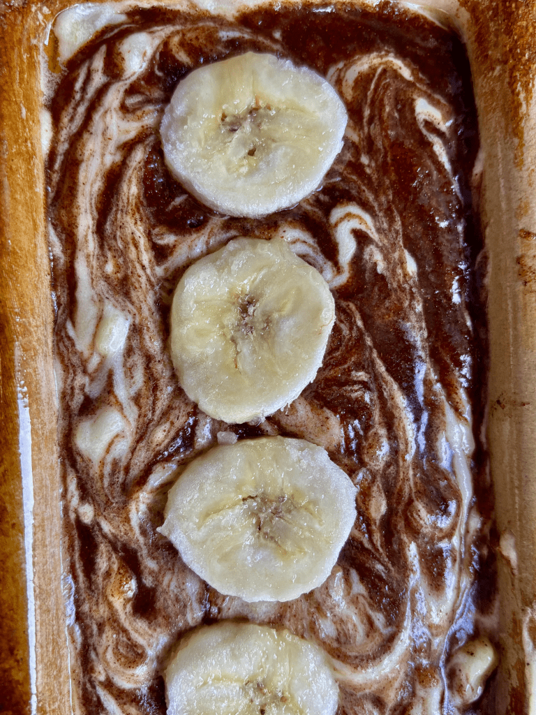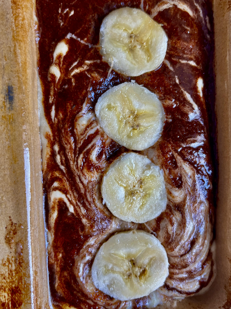 Well, I didn’t get to make it last night. I just couldn’t function enough to make it, so, after our oatmeal this morning, I dove right into making my John his banana bread. Guess what, I didn’t just make banana bread, I made cinnamon swirl banana bread.