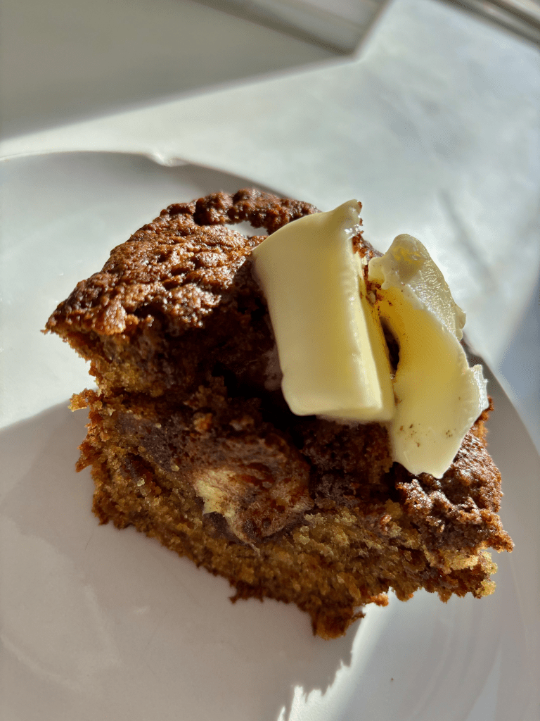 Fresh out of the oven with a couple dabs of butter. Sliced up and ready for John to sink his teeth into. According to John, the bread was delicious.