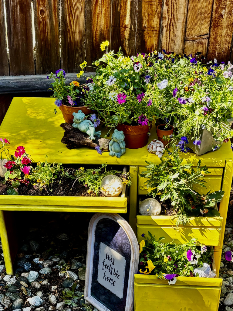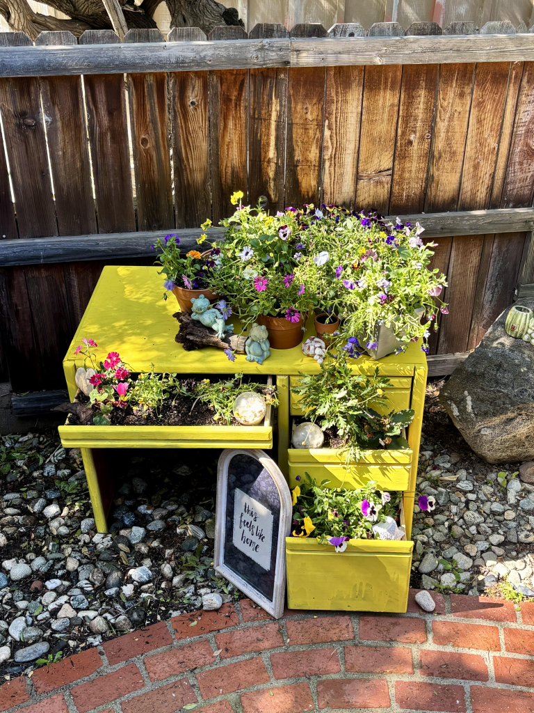 So, today I was up at 6 am, and I mean up. I was out back right away cleaning the yard and guess what, I also painted the old desk I had and planted a few flours. Wanna see?