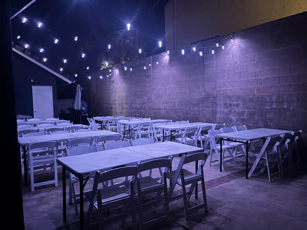 And of course, I must show you the tables and chairs that Kevin, Steve and John set up. They also hung some lights over the tables, and I couldn’t be more thrilled on how those turned out. What do you think?
