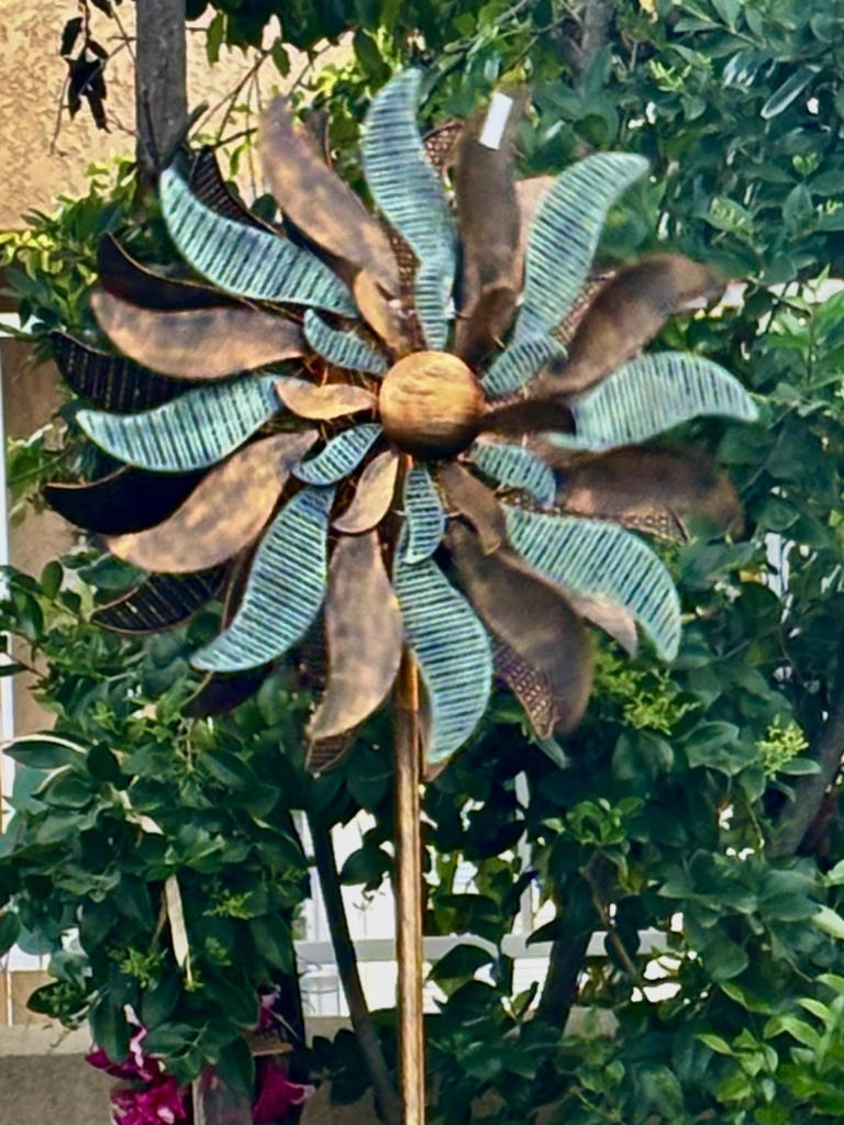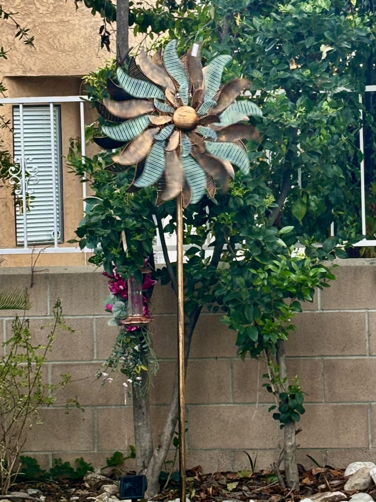 Today has been such a gift for me. John and I woke up to the sunrise lighting up the sky — that soft, cool morning air with just a splash of crisp. I stepped out back to admire my new wind spinner, a sweet surprise from my friend Jan. It’s not just décor; it’s art in motion. Watching those blades twirl around and around is incredibly calming. I didn’t expect to love it as much as I do.